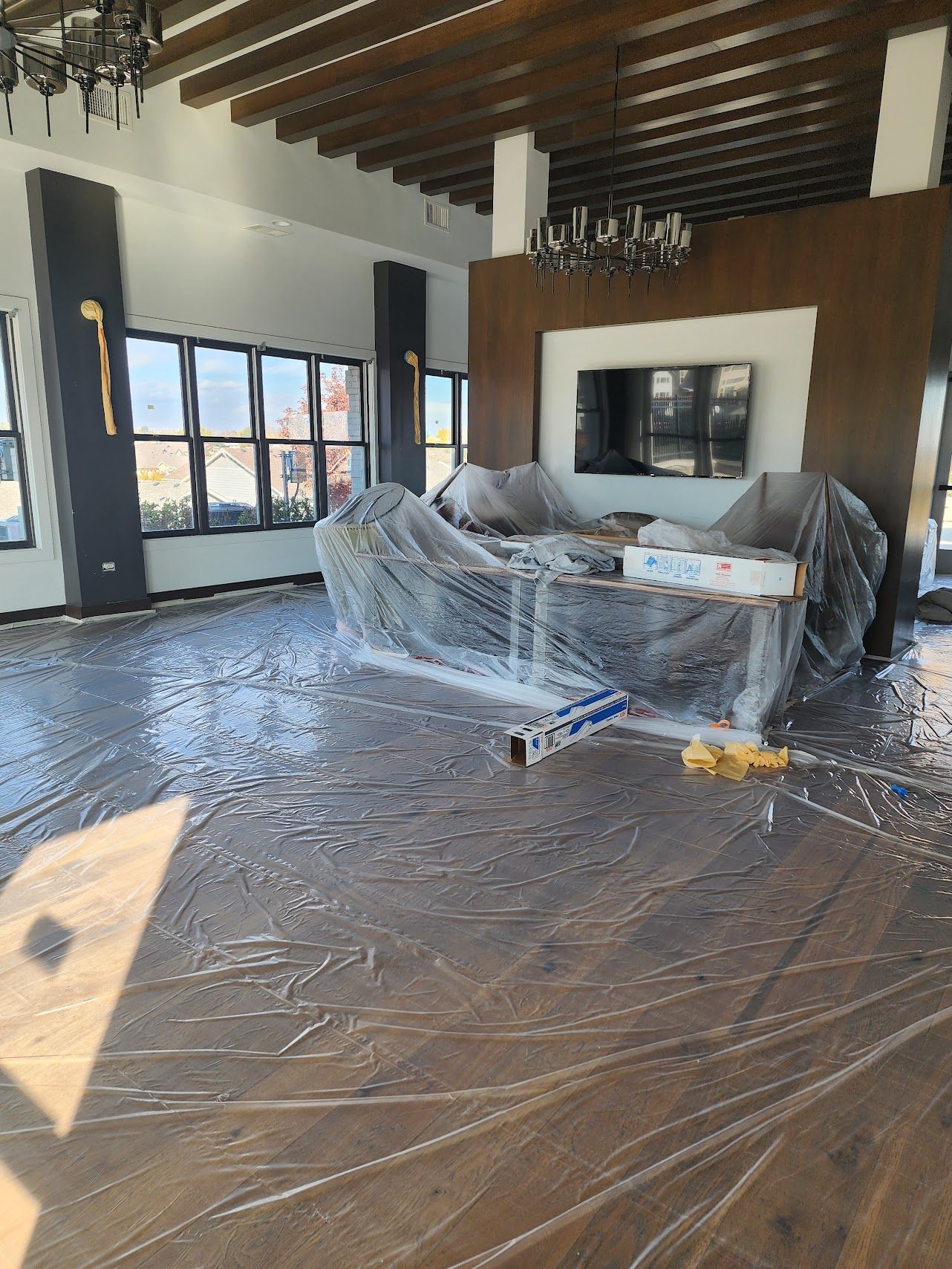 All fixed and sensitive elements within the space are protected with equal care. Windows, trim, fixtures, outlets, and hardware are precisely masked to maintain clean lines and prevent overspray (if a sprayer is in use). In conference rooms and executive offices, wall-mounted televisions, sound systems, whiteboards, and presentation equipment are carefully covered.